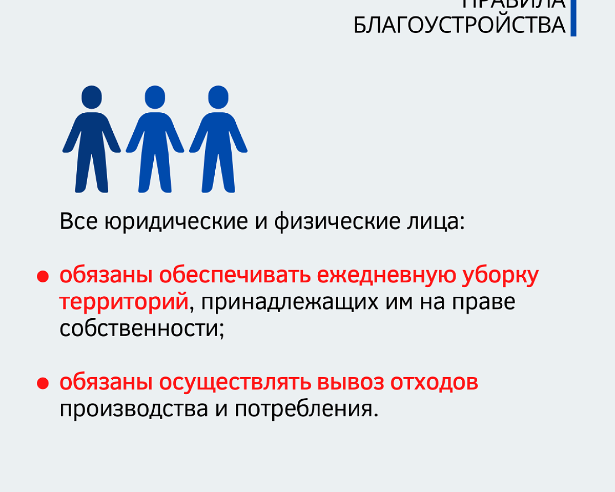 Согласно Правилам благоустройства города Якутска, все юридические и физические лица обязаны обеспечивать ежедневную уборку территорий, принадлежащих им на праве собственности, поддерживать чистоту в течение рабочего дня. Также обязаны осуществлять вывоз отходов производства и потребления, образующихся в результате осуществления ими хозяйственной деятельности и исполнения обязанностей, с целью их утилизации.